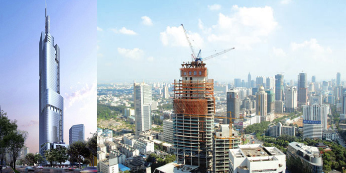 建筑主體高度592.5米,采用中昇建機(jī)ZSL2700(100T)兩臺(tái)。