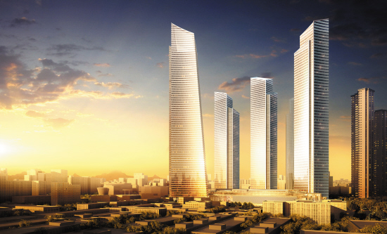 建筑主體高度438米,采用中昇建機(jī)ZSL1250(64T)及ZSL380(32T)各一臺(tái)。