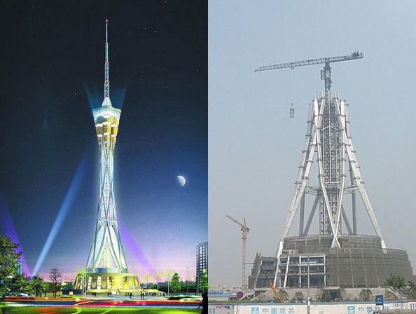施工高度326.6米,采用中昇建機一臺ZSL1000(最大吊重64t) 和一臺ZSL380(最大吊重32t)