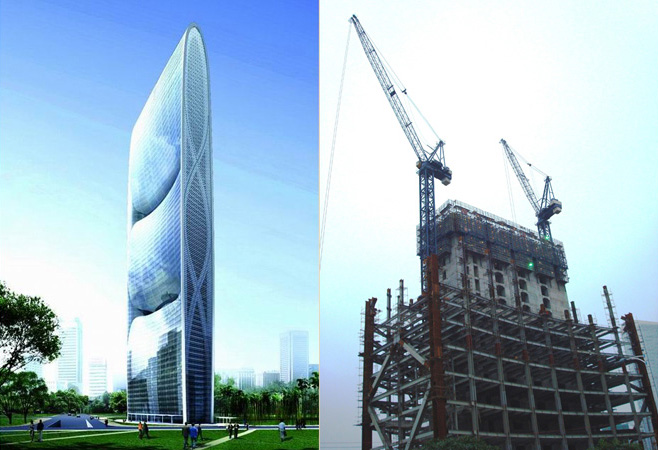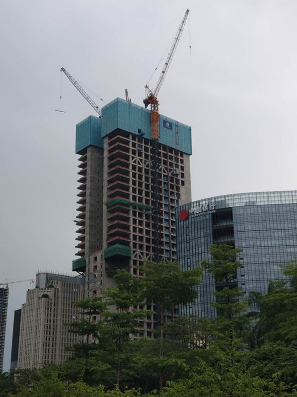 建筑高度330m,采用中昇建機(jī)ZSL1000兩臺(tái),最大吊重64t