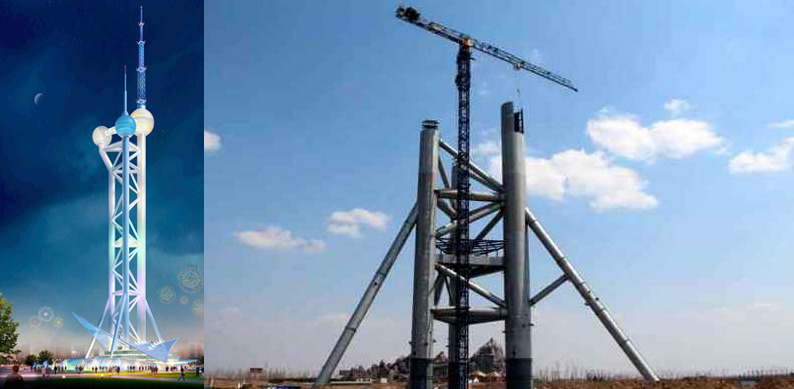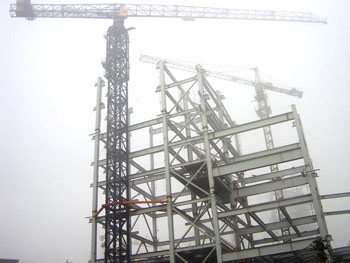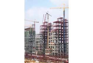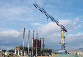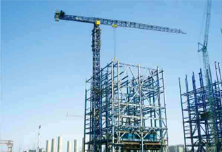 施工高度264.8米,采用中昇建機(jī)內(nèi)爬動(dòng)臂式塔機(jī)ZSL1000(64t)兩臺
