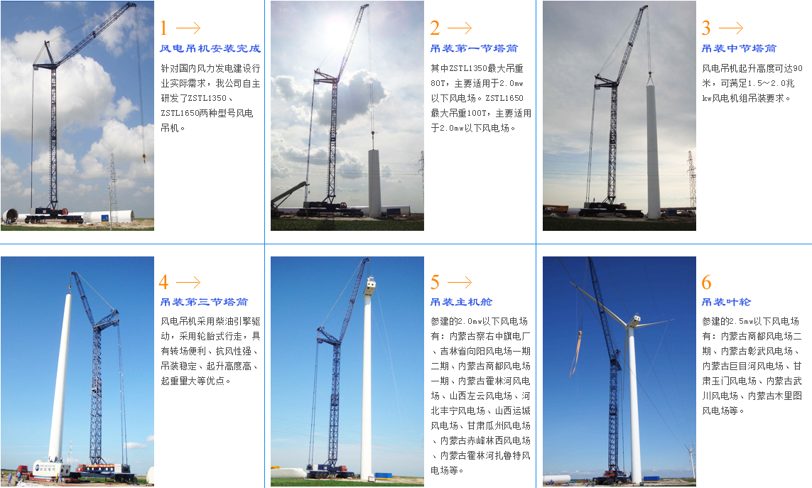 我公司自主研發(fā)了ZSTL1350、ZSTL1650兩種型號風(fēng)電吊機(jī),其中ZSTL1350最大吊重80T,主要適用于2.0mw以下風(fēng)電場。ZSTL1650最大吊重100T,主要適用于2.0mw以下風(fēng)電場。